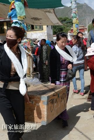國家旅游地理 西藏拉薩8月9日訊 8月6日,在西藏堆龍德慶縣乃瓊鎮(zhèn)甲熱村,覺木隆藏戲團團長瓊達(前右)在演出后和團員一起搬運道具。藏戲是藏族人民喜聞樂見的藝術(shù)形式,而發(fā)源于甲熱村(舊稱覺木?。┑挠X木隆藏戲在藏戲各流派中流傳最廣。