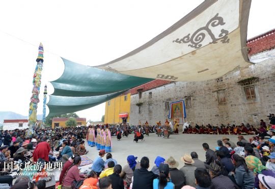 8月6日,在西藏堆龍德慶縣乃瓊鎮(zhèn)甲熱村,甲熱村覺木隆藏戲團在村里的雪頓節(jié)曬佛慶典上表演。