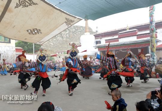 8月6日,在西藏堆龍德慶縣乃瓊鎮(zhèn)甲熱村,覺木隆藏戲團的演員們在村里的雪頓節(jié)慶典上表演。