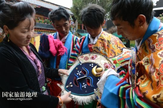 8月3日,在西藏堆龍德慶縣乃瓊鎮(zhèn),覺木隆藏戲團團長瓊達(中)和演員們準備參加鄰近幾個村的望果節(jié)演出。