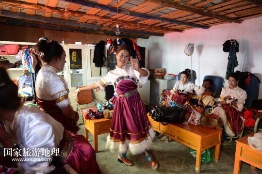 如今瓊達的藏戲團每年演出200多場。一年一度的羅布林卡雪頓節(jié)藏戲匯演自然是重中之重,藏歷年和望果節(jié)也是劇團最繁忙的時候。為了增加收入,劇團還承接賓館酒樓和朗瑪廳等場所的小型演出任務(wù),表演內(nèi)容有藏戲,也有民族舞蹈。劇團每年總收入二十多萬。演員參加排練一天工資50元,參加演出一天工資100元。在淡季,他們還要回到農(nóng)田干活。雖然在劇團的收入不高,比起幾年前已經(jīng)有了很大進步。