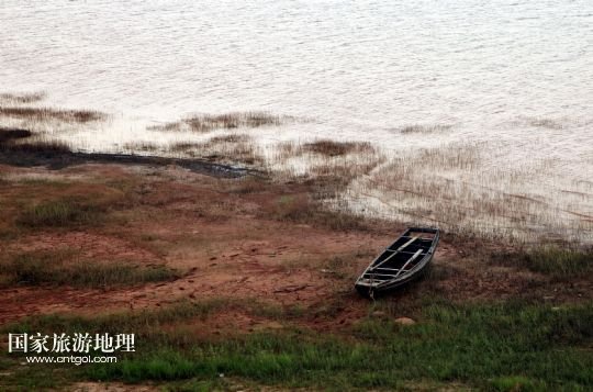 8月8日,一只小漁船擱淺在“瘦身”后裸露的鄱陽(yáng)湖湖岸。