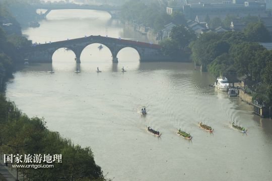國家旅游地理 浙江杭州11月9日訊 11月9日,參加500米直道競速賽的龍舟隊從運河拱宸橋畔出發(fā)。當日,2013年中國龍舟公開賽年度總決賽(杭州站)在京杭大運河杭州拱宸橋段舉行。 /新華社發(fā)(李忠 攝)