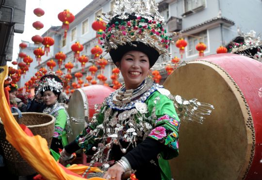 國家旅游地理 湖南湘西2月15日訊 2月14日,湖南鳳凰苗族婦女打起苗鼓。當日是農歷元宵節(jié),在湖南鳳凰古鎮(zhèn),當?shù)鼐用衽c游客歡聚一堂,共同參與各種民俗文化表演活動,慶祝節(jié)日。 /新華社記者 范軍威 攝
