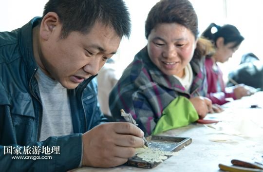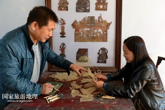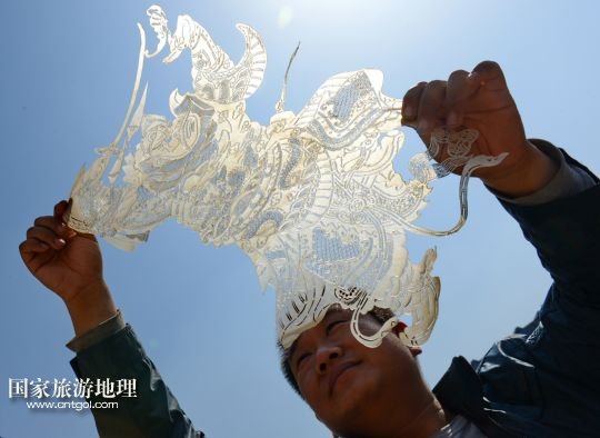 國家旅游地理 河北唐山4月2日訊 郭寶在檢查一件皮影藝術(shù)品的雕刻質(zhì)量(3月30日攝)。河北省遷安市趙店子鎮(zhèn)馬古寺村村民郭寶自幼喜歡皮影雕刻,師承當(dāng)?shù)氐窨趟嚾送跽淅舷壬?,他雕刻的影人造型古樸、工藝精?xì),深受皮影收藏愛好者的歡迎。2003年,郭寶成立了“郭寶皮影傳承工作室”,并從村里招來20多位喜歡皮影藝術(shù)的農(nóng)民專門從事皮影雕刻。經(jīng)過幾年的發(fā)展,如今郭寶皮影工作室開發(fā)設(shè)計(jì)皮影工藝品3000余種,在傳承保護(hù)唐山皮影的同時(shí)還獲得了豐厚的收入。 /新華社記者楊世堯攝