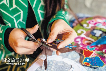 ↑剪紙模是拼布繡的第一個(gè)步驟,手藝人需要格外細(xì)心,才能剪得恰到好處。