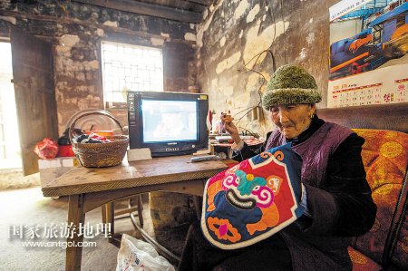 ←在一臺(tái)老式電視機(jī)的陪伴下,廖西鳳悠閑地繡著傳統(tǒng)的拼布繡。