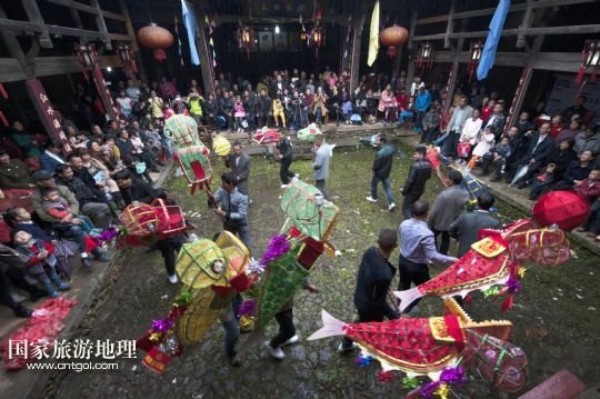 國家旅游地理 浙江麗水11月10日訊 11月8日,浙江景寧畬族自治縣九龍鄉(xiāng)嶺里村的村民在徐氏宗祠內(nèi)表演傳統(tǒng)非遺節(jié)目——魚燈。當(dāng)日,浙江省麗水市景寧畬族自治縣“中國畬鄉(xiāng)魚燈藝術(shù)村展示非遺之美·慶祝豐年活動”在九龍鄉(xiāng)嶺里村舉行。嶺里村自古有在節(jié)日里舞魚燈的習(xí)俗,寄托著人們期望生活吉祥如意、連年有余的美好愿望。 新華社發(fā)(李肅人 攝)