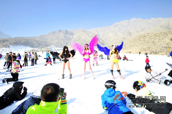 2016年1月1日,新年第一天,在銀川蘇峪口國家森林公園滑雪場(chǎng),幾位身著色彩艷麗比基尼美女在雪中秀身材并展示瑜伽技巧,吸引了眾多滑雪愛好者的目光。當(dāng)日,蘇峪口滑雪場(chǎng)前來滑雪的人達(dá)數(shù)千人。 寧夏新聞網(wǎng)記者 祁瀛濤 攝