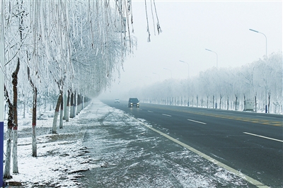 12月23日,銀川永寧快速通道兩旁呈現(xiàn)“霧凇”美景。據(jù)了解,霧凇俗稱樹(shù)掛,是一種冰雪美景。它是由于霧中無(wú)數(shù)零攝氏度以下而尚未結(jié)冰的霧滴隨風(fēng)在樹(shù)枝等物上不斷積聚凍粘的結(jié)果。霧凇現(xiàn)象在我國(guó)北方是很普遍的。記者 吳春霖 攝